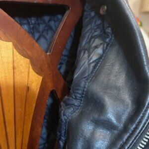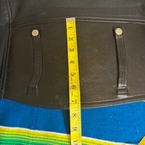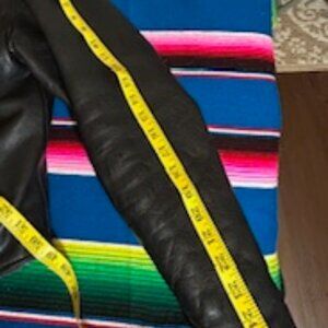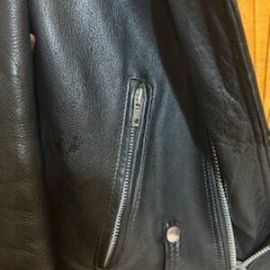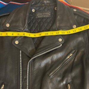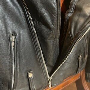 Heavy duty Harley Davidson black leather jacket with built-in spleen guard (we called them kidney belts in the '70s because rigids did not have shocks) but does not have the actual belt w/buckle . The jacket is in good condition, I bought it in 1990s and it was vintage then. The jacket lining is in good condition -no rips or stains. All the zippers and snaps work. The jacket weighs approximately 5 lbs .I have been riding Harleys since 1976 but look carefully at the tags, that is how I dated it. It seems a shame to just keep this jacket hanging up; someone should be enjoying it!