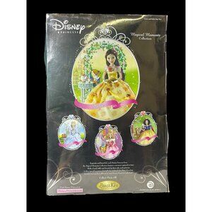 A regal tribute to Disney’s Beauty and the Beast, this 2007 Brass Key Keepsakes Belle doll captures the elegance and charm of the beloved princess in porcelain. Belle wears her iconic yellow ball gown adorned with pink roses and holds a golden book—symbolizing her love of knowledge and story. The packaging features a garden scene with the Beast, Mrs. Potts, and Chip, framed by floral accents and castle imagery.