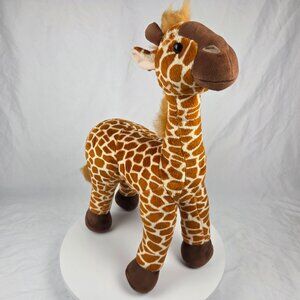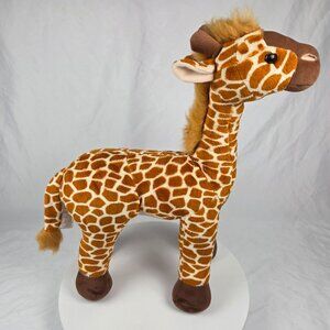 The product is a rare 2017 Toys R Us Geoffrey Giraffe 21" plush standing bendable toy. This colorful giraffe stuffed animal features wire legs and a wire neck, making it easy to pose in different ways. It is part of the character family of Geoffrey Giraffe and is recommended for children ages 2 and up. This medium-sized plush toy is perfect for kids who love animals and imaginative play, and would make a fun addition to any stuffed animal collection.
