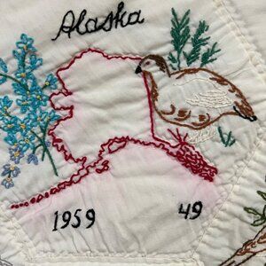 Rare 70s Hand Stitched Heirloom State Flowers Birds Statehood Patchwork Quilt