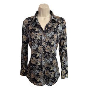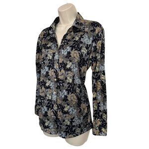 Rare 70s Vintage Brown, Black & Gray Floral Long Sleeve Button Down Top Size M