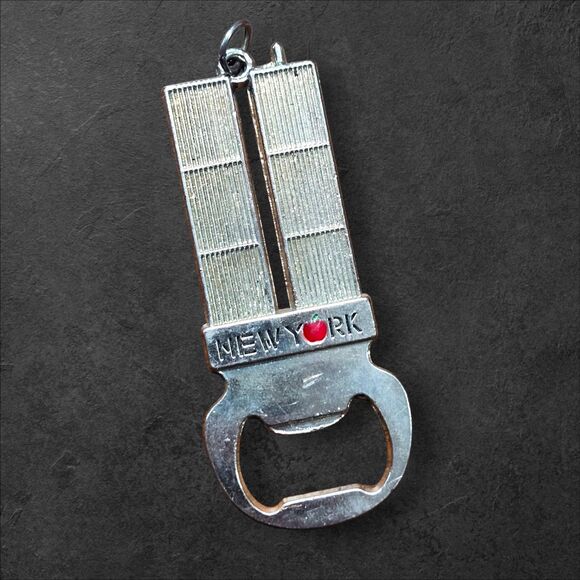 A powerful commemorative keepsake honoring New York and the events of September 11th. This rare metal bottle opener is shaped like the Twin Towers and features NEW YORK with a red apple detail symbolizing the heart of the city.