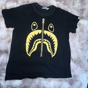 Up for grabs is a highly sought-after A Bathing Ape (BAPE) "WORLD GONE MAD" t-shirt featuring the iconic shark graphic! This tee is a statement piece from the renowned streetwear brand, known for its bold designs and exclusivity. The striking gold shark print on the black cotton makes this a standout addition to any wardrobe.
