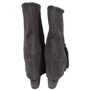 These Rare Alice & Olivia Grey Foldover Hidden Heel Yeardley Boots in size 37 are a stylish and trendy choice for any woman looking to make a statement. With a round toe shape, high wedge heel, and ankle shaft style, these platform boots are both fashionable and comfortable. The gray suede material, leather lining, and hidden heel detail add a touch of luxury to these versatile boots, making them perfect for parties, cocktails, or casual outings during the winter, fall, or spring seasons. The zippered accents and unique design make these boots a standout piece in any wardrobe.