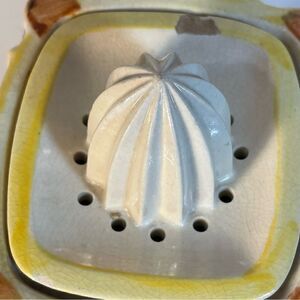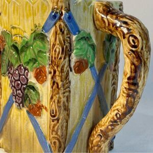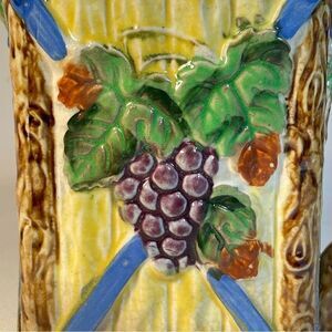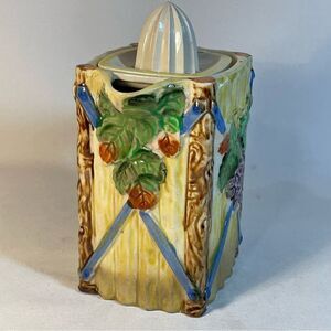 with a yellow picket fence background as well as posts with grapes and leaves. The rectangular base and reamer are made so that the reamer doesn't rotate when it's used. The pitcher is approximately 4” by 3 ¾”, 7" with the handle and is 6 ½”tall. The reamer is part of the lid.