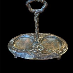 Rare Antique silver salt & pepper caddy dragons around the base made in Japan. 5” x 3” see photos for details.