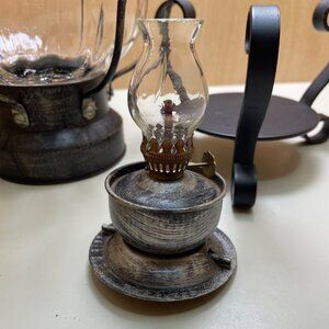 This antique-style lantern features a black metal frame and a clear glass globe, paired with a decorative stand and mini oil lamp insert. Designed for both functional and decorative use, its rustic aesthetic enhances various indoor or outdoor settings. The sturdy construction ensures durability while the intricate design adds a timeless charm. Made in Hong Kong.