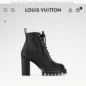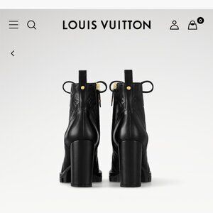Description: Authentic LV Star Trail ranger boots. These are an extremely hard to find, stylish and extremely comfy boots. If you love empriente leather on your LV handbag, you will LOVE this all leather boot on your feet. The leather is embossed with LV monogram. I got these because I kept seeing that the canvas version of these cracks in the toe and tongue area. These are all calf leather, so durability is great to me.