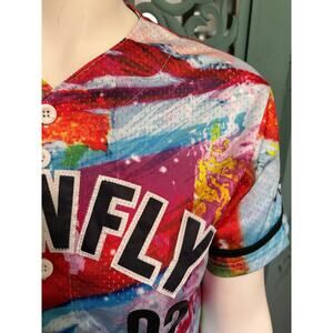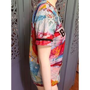 This shirt is a rare find but so much fun! The fabric looks like it has been sprayed with bright paint, and the style is like a baseball shirt. Great teen hip hop shirt. Size Large (14-16) measures 19" across chest from pit to pit. Buttons up front.