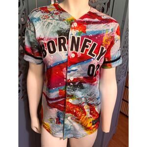 Rare BORN FLY 02 Baseball Design Button Up Shirt S/S-Spray Paint-Hip Hop L 14-16