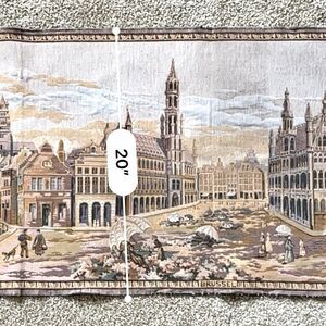 This rare Belgium tapestry featuring a city scene from Brussels, Bruges, and Gent is a stunning addition to any home decor. Measuring 20" in height and 59" in length, this vintage piece showcases intricate details and vibrant multicolor patterns. The tapestry is decorated with fringe and is perfect for adding a touch of European charm to your living space. Made in Belgium, this horizontal orientation tapestry is a unique and eye-catching piece that will surely be a conversation starter in any room.