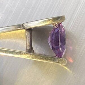 light, it is possible this stone might be a rare Alexandrite. It is round and held in place by two slots cut into the silver. There is