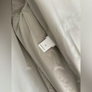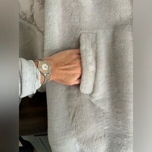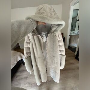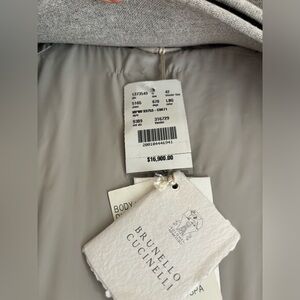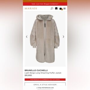 BRAND NEW, NEVER WORN, TAGS STILL ON. Beautiful lamb fur coat with hood. Light beige color. Retail price $16,900. Comes with Cucinelli hanger and Marios garment bag.