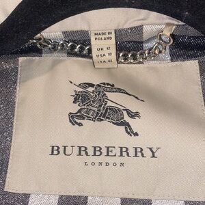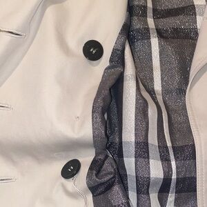 Burberry Trench. Traditional Burberry trench color with some flair. double breasted, back hem ruffle, sparkle Burberry plaid lining.