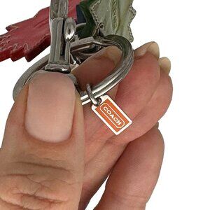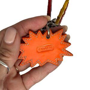 Super rare collectible COACH comic book action sounds keychain in excellent used condition. Keychain is made of brightly colored patent leather with common comic book fight sounds: 'Pow", "Zap" and "Bam" stitched on in a contrasting color; Coach logo embossed on reverse and small metal orange Coach tag attached to the keyring. The colors of the charms are yellow with red writing; orange with ivory; red with navy blue; navy with army green; and army green with yellow. Some slight overall wear, most noticeable on the yellow "Pow" charm since it's the lightest in color and shows some minor color transfer on the front and back. It looks like there is a loose stitch in one of the corners on the back of the army green charm but it's not super noticeable. **Please refer to all images for exact condition as they are part of the description.**