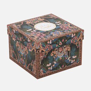 Brand new in box. The Fearless Felis Tea Cup And Saucer Set is patterned with a sea of rich midnight hues enveloped by gold baroque details, cascades of forest ferns and soft botanicals dipped in honey hues that bloom from emerald vines.