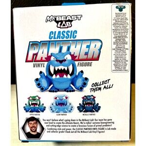 The product is a rare Chase Mr Beast Lab Classic Panther Blue Vinyl Figure, standing approximately 3.5 inches tall. Manufactured in 2024, this figure is part of the Mr Beast franchise and features a blue panther design. Produced by Moose, this original vinyl figure is themed around internet culture and showcases Mr Beast as the featured artist. Packaged in a box, this collectible item is a unique addition for fans of Mr Beast and action figures alike.