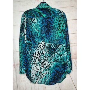 Rare Chico’s Aqua Green Leopard Print Sheath Shirt with faux diamond rhinestone buttons, long sleeves, and a breathable lightweight design.