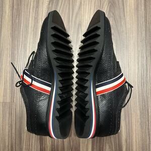 Rare sold out Thom Browne longwing brogue with RWB webbing strap & threaded rubber sole in pebble grain.