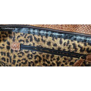 Crafted by the renowned Clever Carriage Company, this large tote is a testament to sophisticated style and enduring quality. The exterior is fashioned from premium leather in a versatile brown hue, complemented by intricate embroidered accents that add a touch of elegance. The tote is spacious enough to accommodate your daily essentials, making it an ideal choice for both work and leisure. The lace fabric lining adds a delicate contrast to the bold exterior, while the croc-embossed leather detail exudes a refined luxury that is sure to turn heads.