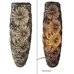 Size: 14”high x 14”wide x 1.5” wide (approximate). 1.25” wide silver, metallic leather strap with a 15” drop.