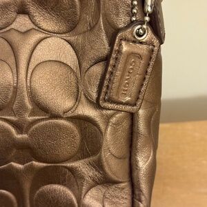 This stunning Coach mini bag is the perfect accessory to elevate any look. The unique metallic bronze finish catches the light beautifully, while the embossed pattern adds a touch of subtle texture. Its compact size is ideal for carrying essentials without weighing you down, and the versatile strap options make it easy to transition from a sophisticated top-handle bag to a convenient crossbody. It's a statement piece that's both fashionable and functional.