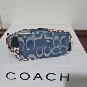 This is a rare, limited edition Coach bag, style number 40530. top handle denim patchwork pouch which features signature, leather and animal prints for the body and gorgeous tobacco leather handle, zipper pull, hang tag and creed patch. it also has the embroidery violet applique and denim demi pocket with Coach logo embossed brass button on the front. lined in dark blue fabric and measures 9" x 5" x 3". it is in excellent, like new condition as there are no flaws or wear noted.