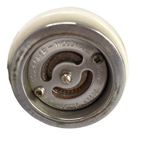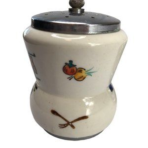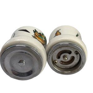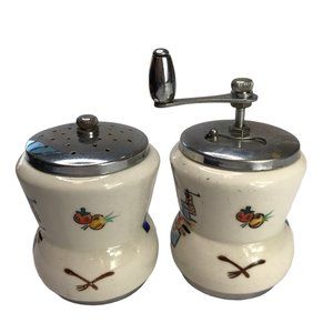 Set of Two Salt and Pepper Shakers Pepper Grinder. White Ceramic with Stainless Steel Crank. Painted Image.