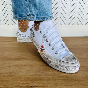 featured in their classic low-top canvas silhouette with scuffed-up bumpers and