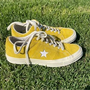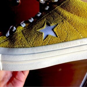 Rare⭐️ Converse One Star OX x Golf Le Fleur Tyler The Creator OG Sulphur Size M8 W10 Another Converse One Star Ox, designed by Tyler The Creator. Known as the "Sulphur" edition, they are a part of Golf Wang's "Golf le Fleur" Collection. This pair comes in Sulphur and white. Sporting a full suede upper with flower stitching around the star logo on the sides, a debossed "Golf le Fleur" logo on the tongue, an embroidered bee logo on the back heels and custom graphics on the insoles and bottom of the outsole. You can also find the phrase, "don't let 'em kill your flowers, water your garden and stunt" on the sockliner as well as the outsole. Their release date was August 3rd, 2017. If you're a fan of Tyler The Creator or the Converse One Star, make sure you have a pair of these in your collection. Good preowned condition, they need some cleaning , please see the photos❤️ Make an offer😉 Bundles of 3+ items get an additional discount💸 Shipping on the next business day🚀
