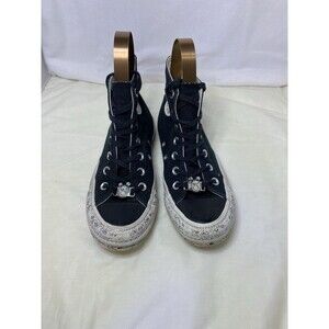 These rare Converse x Miley Cyrus Chuck Taylor All-Star High Tops CTAS 162234C in women's size 6 are a stylish and versatile sneaker designed for various occasions such as activewear, casual wear, and workwear. Made with canvas fabric and featuring a paisley pattern, these high-top sneakers are perfect for all seasons and come in a trendy black color. With a rubber outsole for durability and comfort, these Converse shoes are adorned with the signature Chuck Taylor All-Star design and are part of the Converse celebrity product line. Perfect for fans of Miley Cyrus and those looking for a chic and practical footwear option.