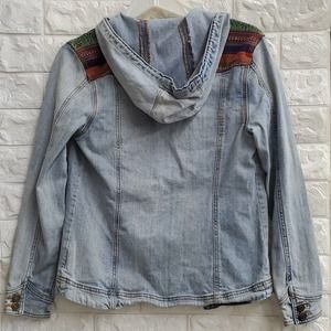 Boho distressed denim hooded jacket with pockets - back to school, fall, southwestern blanket, pocket detail.