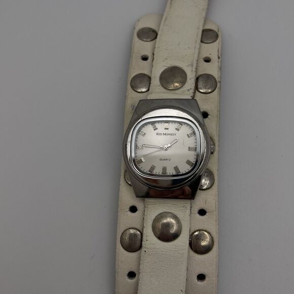 Rare Custom Red Monkey SLAYER Distressed Watch, Wide WHITE STUDDEDLeather Band