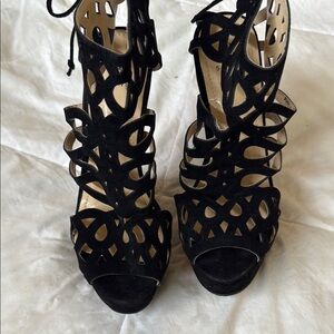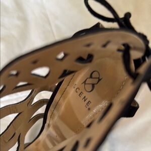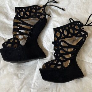 These gravity defying, dramatically curved black heels from Scene showcase a stunning cut-out pattern in a velvet-like material and tie closure in the back. The intricate geometric lattice design and unique sculpted high heel make them ideal for formal occasions or anytime you feel like being the showstopper! Only worn once to a wedding and are in great condition. Make an offer to stand out in these vintage gorgeous wedges! ☺️