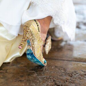 These shoes are amazing they are the most beautiful shoes I have ever seen. When you step into them you know they are special. If you having a princess wedding you must have these. In good pre-owned condition, light wear. See photos. First three photos stock. I have also Included irregular choice adhesive sole protector. (If you are just using for photos, I recommend not to put them on. They have grips so it is not totally clear.)