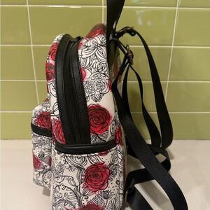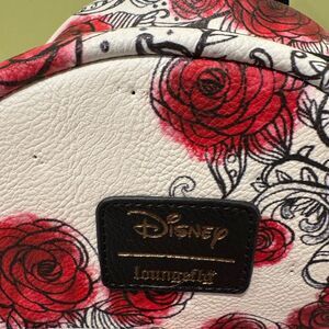 - Genuine Loungefly backpack featuring sketched illustration of Belle, accented by roses for a romantic Disney aesthetic.