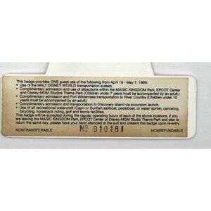 This badge was given to VIP's to wear during the Grand Opening celebration of Disney MGM Studios. It allowed for free admission to any park, admission to all parties and concerts as well as free use of all recreational activities from April 19 - May 7, 1989