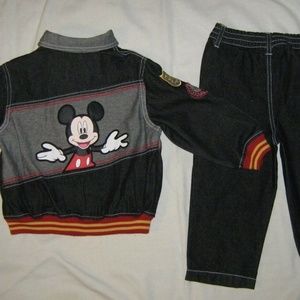 Rare Beautifully Designed Disney Mickey Mouse 3 piece outfit set size 24 months. It is a black and gray denim 1 jacket, 1 pants and 1 red top/shirt. They have many different accents and embroidered patch and more on them. It will be great for yout little prince. Great Gift.