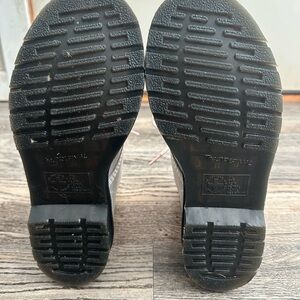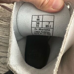 Metallic shiny grey with pink iridescent doc marten boots with classic lace-up design and yellow stitching. Excellent preowned condition, I bought them new and wore for one day. They are beautiful and sturdy, but I find I just don’t have enough opportunities to wear them. Pink sparkle laces.
