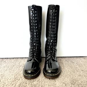 dr martens 1b60, tall doc martens, made in england, combat boots, goth boots, punk fashion, festival style, cyber y2k, alt boots, grunge girl, patent leather boots, vintage docs, lace up boots, , 20 eyelet, knee high boots, rave boots, stompy boots, fetish fashion, chunky sole boots, Dr Martens AW61, Y2K Docs, Unworn Vintage, Tall Docs