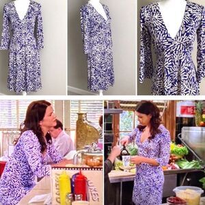 This dress is an ultra rare find! It features a blue, white, and gray print, a v-neckline, and is made of a super soft, comfortable, and flattering silk fabric. It can be seen on Lorelai throughout the majority of the episode. Lorelai is seen wearing this luxurious dress as she strolls through the idyllic Stars Hollow, grabs coffee and a bite to eat at Luke's, works at the Dragonfly Inn, and as she comforts Rory with some of her famous motherly advice.