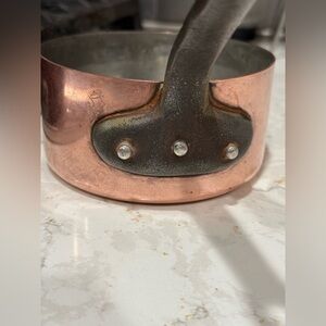 Originating from France, this pot is a reflection of its country's rich history and metalworking traditions. Its unique character is further accentuated by the copper rivets that add a touch of sophistication to its robust construction. This piece is a testament to the artisanship of the past and would be a valuable addition to any collection or a distinctive statement piece in any interior setting.