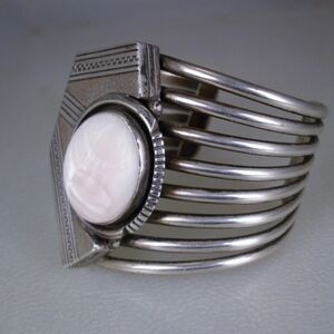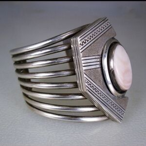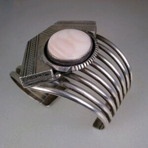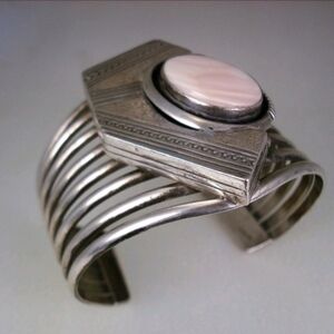 AMAZING VINTAGE NAVAJO STERLING SILVER & MOP MODERNIST BRACELET....This is a fantastic one- of-a-kind hand-crafted bracelet made by Navajo jeweler Will Denetdale early in his career. It is sized for a medium wrist; the inside end-to-end measurement is 5 1/4" plus a 1 1/4" opening and 2 1/8" wide at center. The bracelet is made of sterling silver, signed with his early maker's mark, weighs 70.7 grams. Bery good vintage condition please see photos.