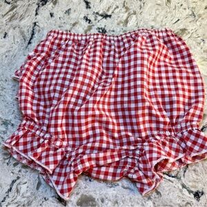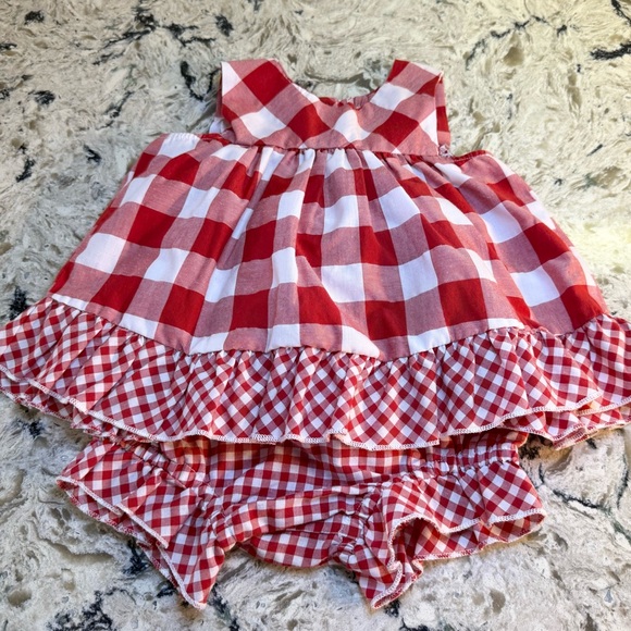 Description: Red and white gingham 2pc set. Ruffle butt bloomers and split back top.