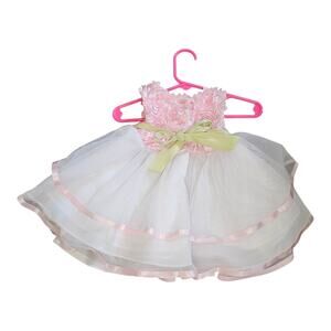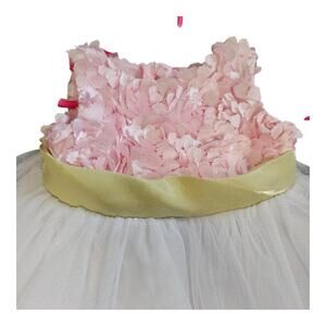 Color: Pink floral textured bodice, light green satin waistband, white tulle skirt with pink ribbon trim