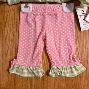 ABSOLUTELY ADORABLE Rare Editions Baby Girl 2 Piece Easter Outfit! The Shirt Is Green & White Checked W/CUTE Little Detailed Bunny On It, Pink & White Polka Dot Ribbon Detail & Bow, Ruffle Detail, & Tie In The Back & A Button Detail As Well! The Little Pants Are Pink & White Polka Dots With Green & White Check Ruffle Detail At The Ankles, & Little Bows On The Sides Of Each Leg! This Outfit Will Look ABSOLUTELY PRECIOUS On Your Baby Girl This Easter!