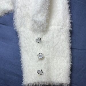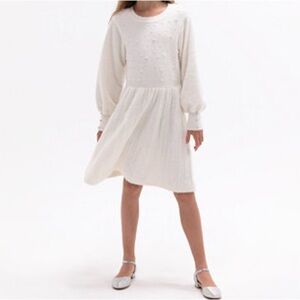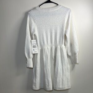A big girls A-line fuzzy sweater dress with pleated skirt, featuring cuff sleeve buttons and imitation-pearl embellished bodice.