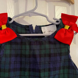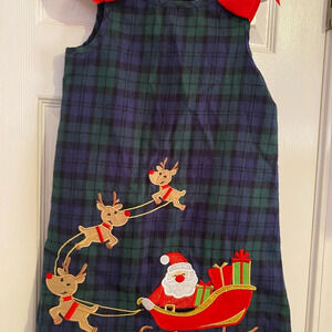 Navy and green plaid dres with Santa and his reindeer on front Red bows on straps Rare Editions Size 4 Smoke free home