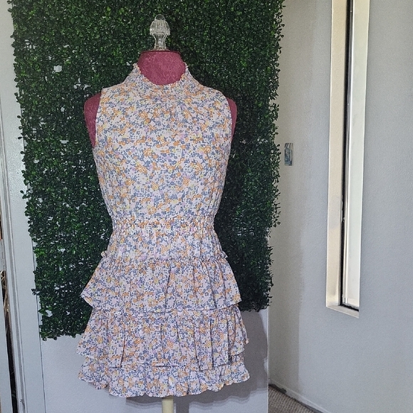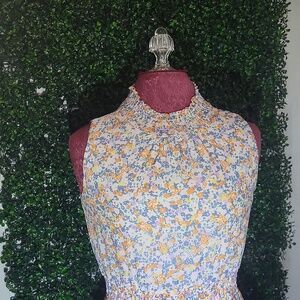 Charming floral dress with ruffle details. Sleeveless design. Perfect for special occasions.