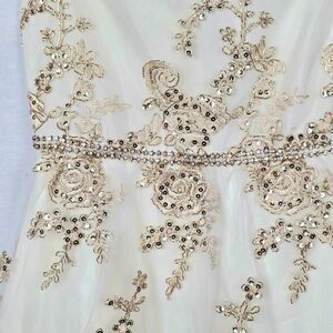 This dress features an elegant ivory tulle overlay with gold floral lace embroidery and sequins throughout. A sparkling rhinestone waistline adds the perfect touch for holiday events, weddings, portraits, or special occasions.